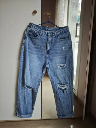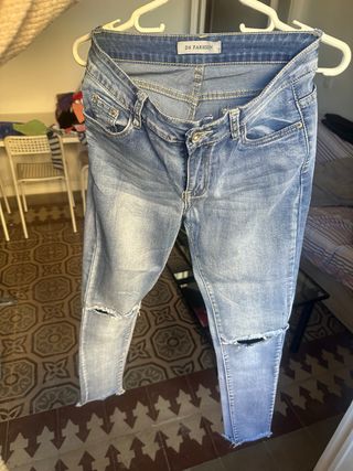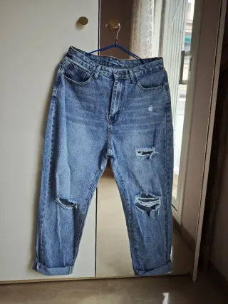 Pantalones vaqueros de mujer con un estilo moderno y desgastado. - Diseño con rotos y efecto desgastado. - Corte ajustado. - Talla S en muy buen estado