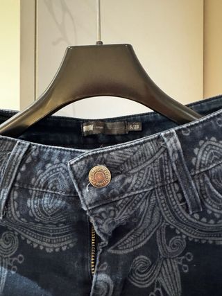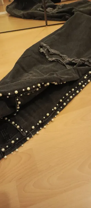 Pantalones vaqueros de corte ancho con un diseño lleno de pedrería brillante. - Diseño con pedrería plateada. - Corte ancho. Está completamente nuevo con la etiqueta, me lo regalaron y me va grande, les costó 70€ (adjunto foto de la web al final)