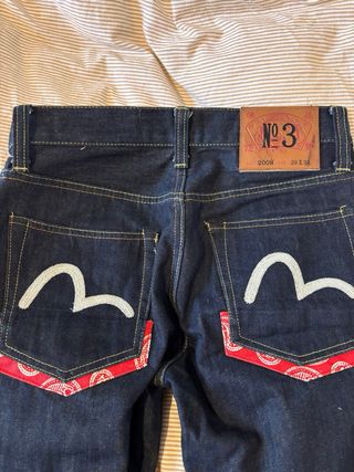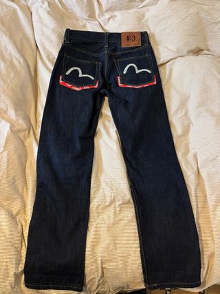 Pantalones vaqueros de la marca Evisu. Mirar la talla en fotos - Diseño con bolsillos traseros. - Detalle de estampado en los bolsillos. - Etiqueta de cuero en la parte trasera.