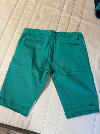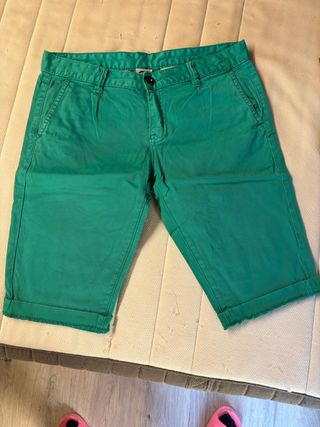 Pantalón corto de tela en color verde. - Cintura con trabillas para cinturón. - Cierre de botón y cremallera. - Bolsillos laterales. - Dobladillo en los bajos.