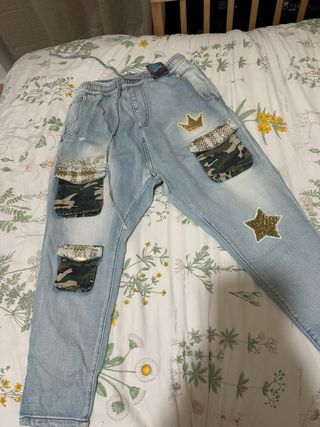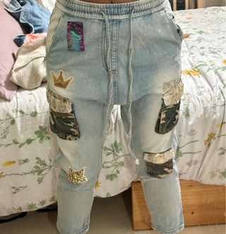 Pantalón vaquero estilo cargo con detalles únicos. - Diseño con parches decorativos. - Cintura elástica con cordón. - Bolsillos cargo en los laterales.