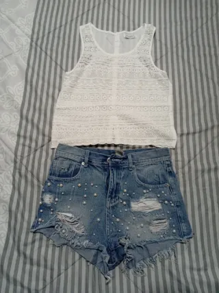 Conjunto de moda compuesto por un top blanco de encaje y unos shorts vaqueros. - Top sin mangas con detalle de encaje. Marca pull&besr - Shorts vaqueros desgastados con perlas. Marca yamamay - Bajo deshilachado en los shorts.