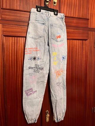Pantalón vaquero de Zara con un llamativo estampado. - Diseño con cremalleras en los bajos. - Bolsillos delanteros con detalle de cremallera.