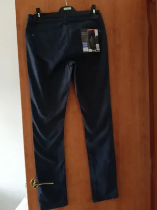 En perfecto estado. Talla XS. Color azul marino, tela como si fuera vaquera pero más agradable. En la parte trasera de la cintura tiene elástico.