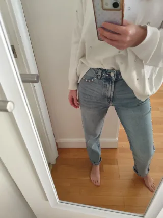 Pantalones vaqueros anchos de Zara, en color crema Son de tiro alto y tienen un corte amplio y fluido. - Tienen un diseño sencillo y elegante. - - El bajo está deshilachado, lo que le da un toque desenfadado.no elástico