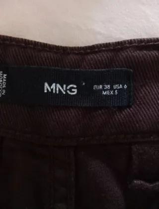 Pantalón vaquero de Mango, talla 38. Corte "globo". Color marrón. Perfecto para invierno ya que es gordito. Tiene el dobladillo hecho para alguien de 160cm. Me lo compré, lo mandé a acortar y cuando lo recibí me quedó grande. Está sin estrenar. Precio en tienda 39€