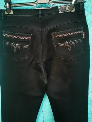 Pantalón negro de corte acampanado, sin estrenar, le faltan las etiquetas, cortadas y luego a mí hija no le gustó como le quedaba, así que no se pudo descambiar,,muy elastico - Cintura más o menos por el ombligo. - Cierre de cremallera y botón. - Bolsillos delanteros y traseros.