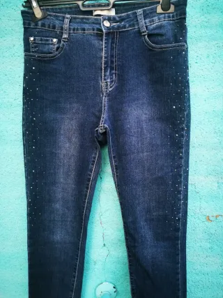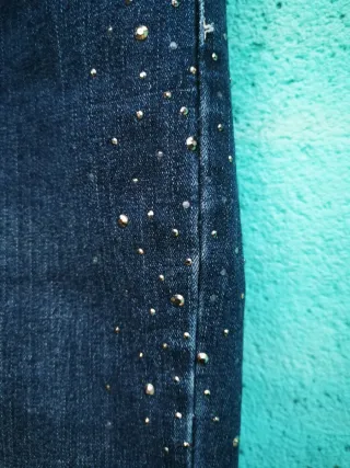 Pantalón vaquero de estilo moderno, con un diseño único. - Tejido denim. - Detalle de pedrería brillante. - Corte ajustado. -Cómodos con tejido que no te aprieta Le faltan algunos remaches y brillos, pero en el conjunto no se nota
