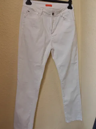 Pantalones vaqueros de corte recto en color blanco. - Cintura con trabillas para cinturón. - Cierre de cremallera y botón. - Bolsillos delanteros y traseros. 34cm de cintura, 104cm de largo. Usados pero bien conservados.