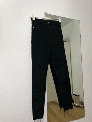 Pantalón vaquero de corte ajustado y color negro. Presenta un diseño moderno con rotos y bajos deshilachados. - Tiro alto. - Cierre de cremallera y botón. - Bolsillos delanteros y traseros.