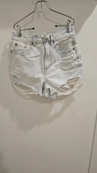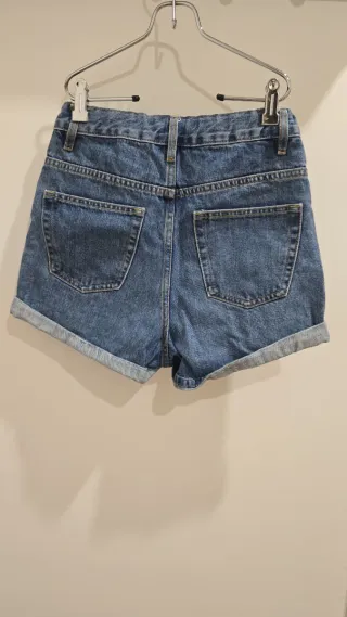 Pantalón corto vaquero con un diseño moderno y cómodo. - Talla S - Estilo mom jean (un poco sueltos) - Tiro alto - Dobladillo en los bajos - Color azul claro, estilo desgastado