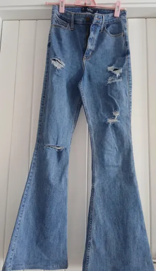 Pantalón vaquero Hollister de tiro alto acampanado, de color azul, con detalles rotos y estilo desgastado. Muy cómodo y favorecedor, perfecto para looks casuales de chicas adolescentes. Envío posible solo a las Islas Canarias.