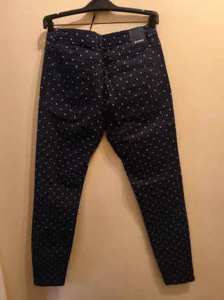 Pantalón vaquero de Stradivarius con un divertido estampado de lunares blancos sobre fondo azul marino. El corte es ajustado y tiene cremalleras en los bajos. - Diseño de lunares. - Cremalleras en los tobillos.