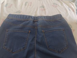 Lote de tres leggings para niña con estampados divertidos. Talla 5/6 pero dan hasta la 7/8, pues son elasticos. No se han usado. - Diseño tipo vaquero con rotos. - Diseño tipo vaquero con rotos y detalle floral. - Estampado floral blanco sobre fondo azul.
