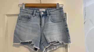 Shorts vaqueros de tiro alto de Zara. - Diseño de cinco bolsillos. - Cintura con trabillas para cinturón. - Cierre de cremallera y botón.