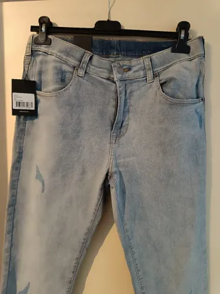 Pantalón vaquero con un diseño moderno y detalles que le dan un toque especial. - Lavado desgastado. - Adornos brillantes en los bolsillos. - Cremalleras en los bajos. Medidas en las fotos