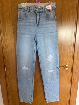 Pantalón vaquero estilo mom con tiro alto y un diseño desgastado. - Cintura elástica. - Aberturas en las rodillas. - Pierna recta.