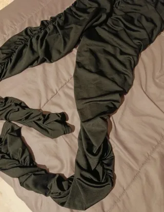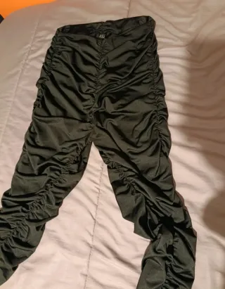 Pantalones de tela elástica con diseño fruncido. - Tiro alto. - Diseño fruncido a lo largo de las piernas. - Tejido elástico para mayor comodidad.