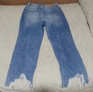 Pantalón vaquero de corte ancho y estilo desgastado. PRECIO NEGOCIABLE - Cintura alta. - Bajo deshilachado. - Bolsillos delanteros y traseros.