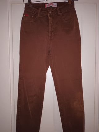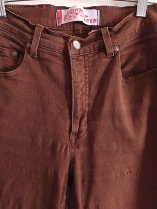 Pantalones vaqueros de corte clásico de la marca Lee Cooper, con un estilo retro de los años 90. Verdadero vintage. Talla 38. Cintura alta. Bajos modificados a 71cm (medidos desde costura interior). Con pequeñas manchas de ligero despintado. Muy buen estado. - Color marrón. - Diseño de cinco bolsillos. - Cierre de cremallera y botón.