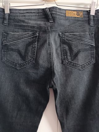 Vaqueros negros mujer Volcom. Muy poco uso. Pernera recta. Talla 28 (38 española). Bajos modificados a 71 cm (medidos desde la costura de dentro). - Lavado desgastado. - Detalle de bolsillo. - Cierre de cremallera y botón.