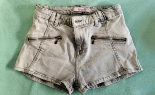 Shorts vaqueros de Bershka con un lavado desgastado. - Diseño de tiro alto. - Dos bolsillos delanteros con cremallera. - Cierre de botón y cremallera. LA ETIQUETA DICE TALLA 40, PERO ES MAS DE TALLA 36