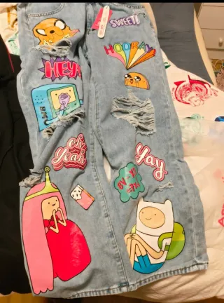 Pantalones vaqueros de estilo desgastado con divertidos parches de Adventure Time. ¡Perfectos para los fans de la serie! - Diseño con rotos y parches. - Personajes: Finn, Jake, BMO, Princesa Chicle y más. - Estilo único y llamativo.