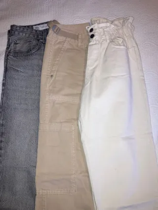Conjunto de tres pantalones para mujer de la marca ZARA. - Pantalón vaquero gris. - Pantalón cargo beige con cinturón. - Pantalón blanco de talle alto. Lote de 3 a 25 euros, por separado a 10 euros cada uno