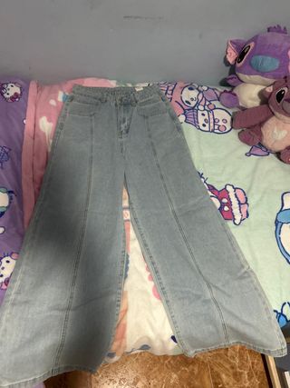 Pantalones vaqueros de corte acampanado y tiro alto. - Diseño desgastado. - Bajo deshilachado. - Cierre de cremallera y botón. En la parte trasera esta un poco dado de si pero puesto no se nota
