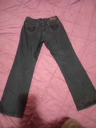 Pantalón vaquero gris de la marca ONE DILEMMA con un diseño llamativo. - Detalle de estrellas plateadas en los bolsillos traseros. - Cintura con tachuelas decorativas. - Corte ancho en las perneras. Los vendo porque al estar fuera de plazo para cambiarlos, no me han admitido ni cambio ni devolución.