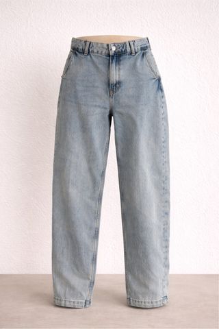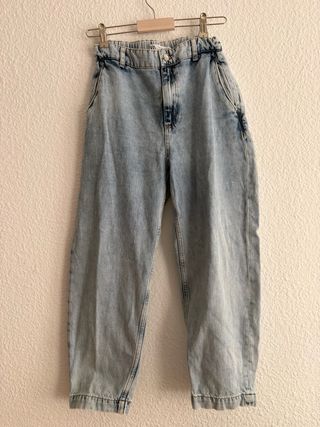 Pantalón vaquero de tiro alto. - Corte relajado. - Lavado claro. Jean Zara talla 34 tiro alto Contorno de cintura 62 cm estirable a 88 cm Largo : 87 cm