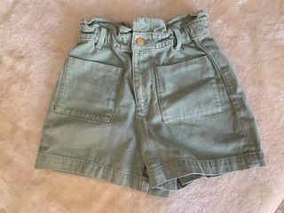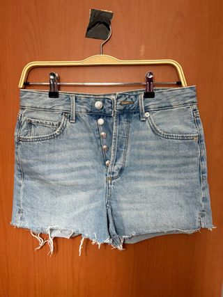 Shorts vaqueros de corte moderno con un acabado desgastado y deshilachado en el bajo. - Cintura alta. - Cierre de botones. - Bolsillos delanteros y traseros.