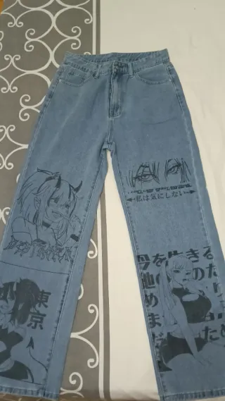 Pantalones vaqueros de corte ancho con un llamativo estampado de estilo anime en ambas perneras. Un diseño único para destacar. - Estampado anime en la parte delantera - Corte ancho y moderno.