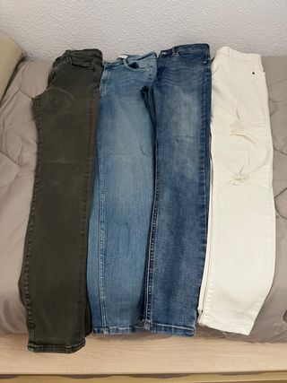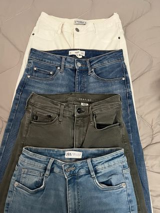 Pantalones pitillo de color verde, balnco y vaqueros. De Mango, Pull&Bear, Zara. Son talla 36/38. 4€ cada uno. En pack también se venden.