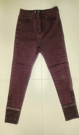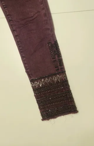 Pantalones vaqueros de corte ajustado con un llamativo detalle de pedrería en los bajos. - Diseño de tiro alto. - Lavado tipo tie-dye en tono morado. - Adorno de cuentas y lentejuelas en los tobillos.