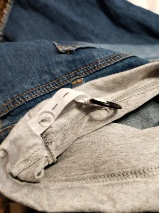 Vaqueros premamá cómodos y modernos, elásticos, con gomas laterales, sin cremallera. Talla L