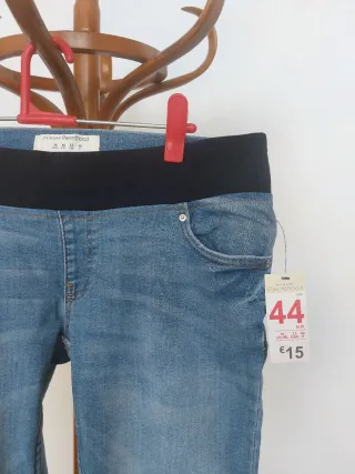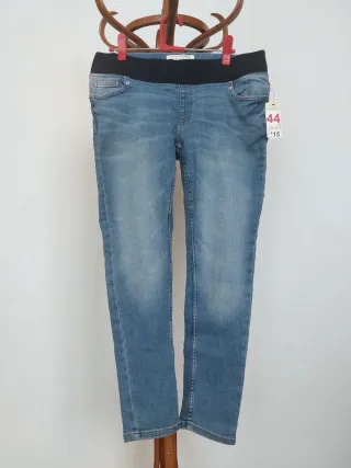 Pantalón vaquero diseñado para premamás. Cómodo y práctico para el día a día. - Tejido vaquero. - Cintura elástica adaptable. - Marca Kiabi , talla 46. Cintura 40cm, de la cintura hasta bajo 28cm