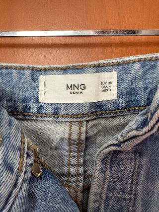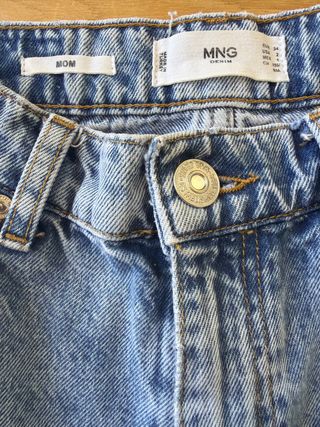 Vaqueros de la marca Mango con corte Mom. - Talla EUR 34. 100% algodon - Fabricados en Turquía. Cintura 34 cms Cadera 50 cms Largo de tiro pierna 67 cms Ancho final 14.5 cms Largo total pantalón 97 cms