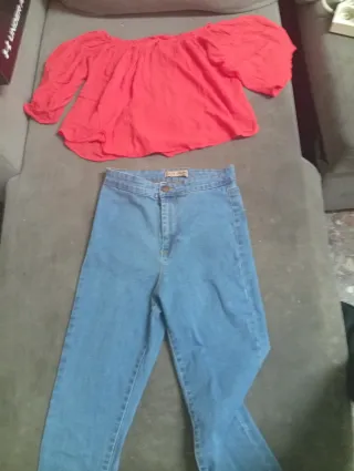 Vaqueros de corte clásico, perfectos para combinar con tu ropa favorita. 38 pequeña - Cintura alta. - Pierna recta. Combinable con el top. Rojo con facilidad d vuelo y botones por detrás. PANTALON SOLO; 2€ TOP SOLO: 2€ CONJUNTO: 3'5€