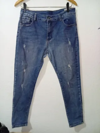 Vaqueros elásticos de tiro medio con efecto push up. - Diseño de cinco bolsillos. - Cintura con trabillas para cinturón. - Cierre de cremallera y botón metálico. Solo 1 uso. No hago envios Tejido super elástico