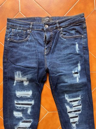 Pantalones vaqueros de corte skinny de la marca Lefties. Presentan un diseño moderno con rotos y desgastes. Talla 42 eu - Corte ajustado. - Estilo desgastado y roto. - Cierre de cremallera y botón.