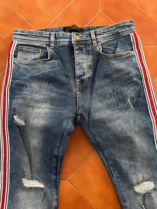 Pantalón vaquero de Zara con un diseño moderno y detalles llamativos. Talla 42 eu - Raya lateral en color rojo y blanco. - Efecto desgastado y rotos. - Bajo deshilachado.