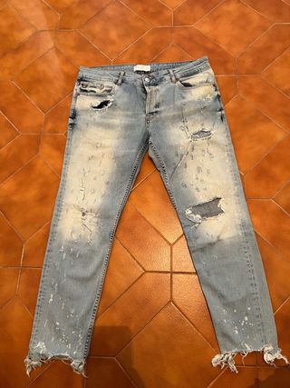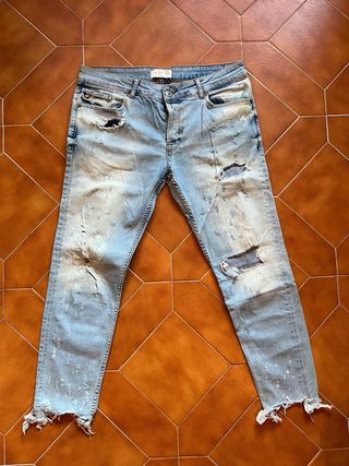 Pantalón vaquero estilo skinny con un diseño moderno y desgastado. Talla 42eu - Efecto salpicado de pintura blanca. - Roturas estratégicas en rodillas. - Bajo deshilachado. - Corte ajustado.