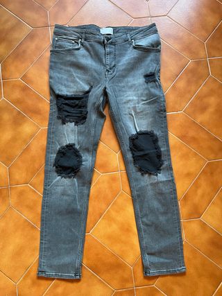 Pantalones vaqueros estilo skinny de ASOS en color gris. Presentan un diseño desgastado con rotos y parches. Talla 42 eu - Corte ajustado. - Detalle de rotos en rodillas y muslos. - Parches negros en las rodillas.