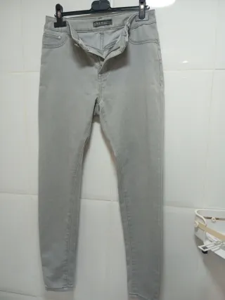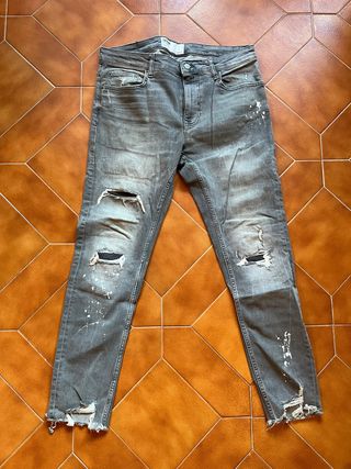 Pantalones vaqueros estilo skinny con un diseño moderno y desgastado. Talla 42 eu - Tono grisáceo con detalles de pintura blanca. - Roturas y deshilachados en rodillas y bajo. - Corte ajustado. - Cintura con trabillas para cinturón.