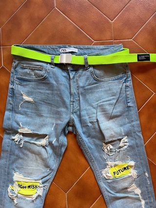 Pantalones vaqueros estilo skinny de Zara con un diseño moderno y desgastado. Incluyen detalles llamativos que añaden un toque único. Talla 42 eu - Cinturón de color verde neón incluido. - Parches amarillos con texto en las rodillas. - Efecto desgastado y rotos. - Bajo deshilachado.