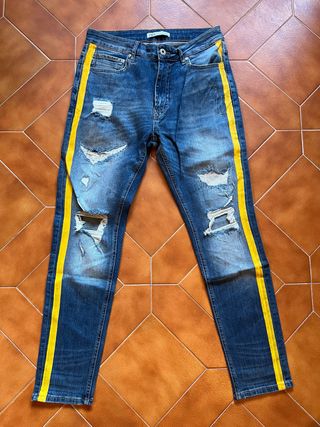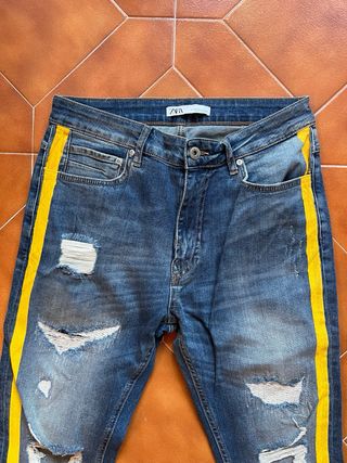 Pantalón vaquero de Zara con un diseño moderno y llamativo. - Raya lateral de color amarillo. - Efecto desgastado con rotos. - Corte ajustado.