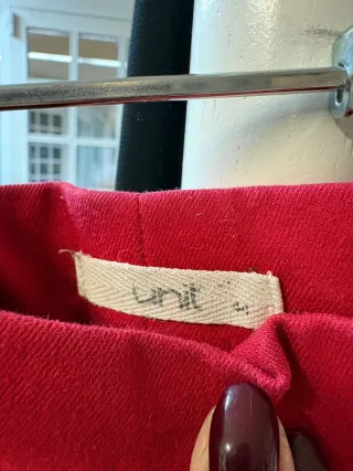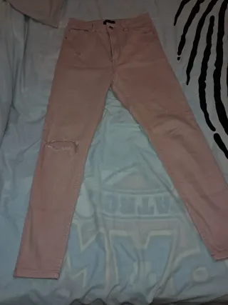 Pantalón vaquero de color rosa, con un diseño moderno y detalles desgastados. - Talla L / 40. - Corte recto. - Cintura alta. - Bolsillos delanteros y traseros. - Cierre de cremallera y botón. -Elásticos