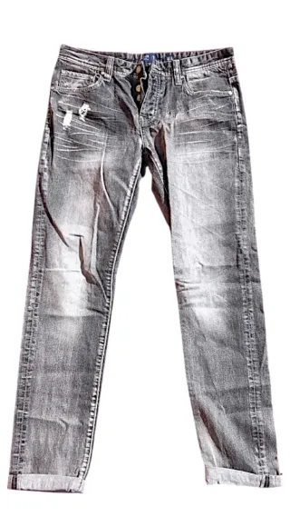 Pantalón vaquero para hombre con un moderno acabado gris. Diseñado para ofrecer comodidad y estilo. - Corte recto. - Cierre de botones. - Efecto desgastado. - Dobladillo en los bajos.