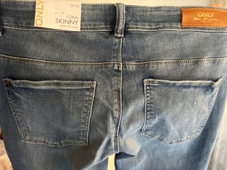 Pantalones vaqueros de corte skinny de la marca ONLY. - Diseño de tiro súper bajo. - Lavado en tono azul. - Etiqueta de cuero en la parte trasera.